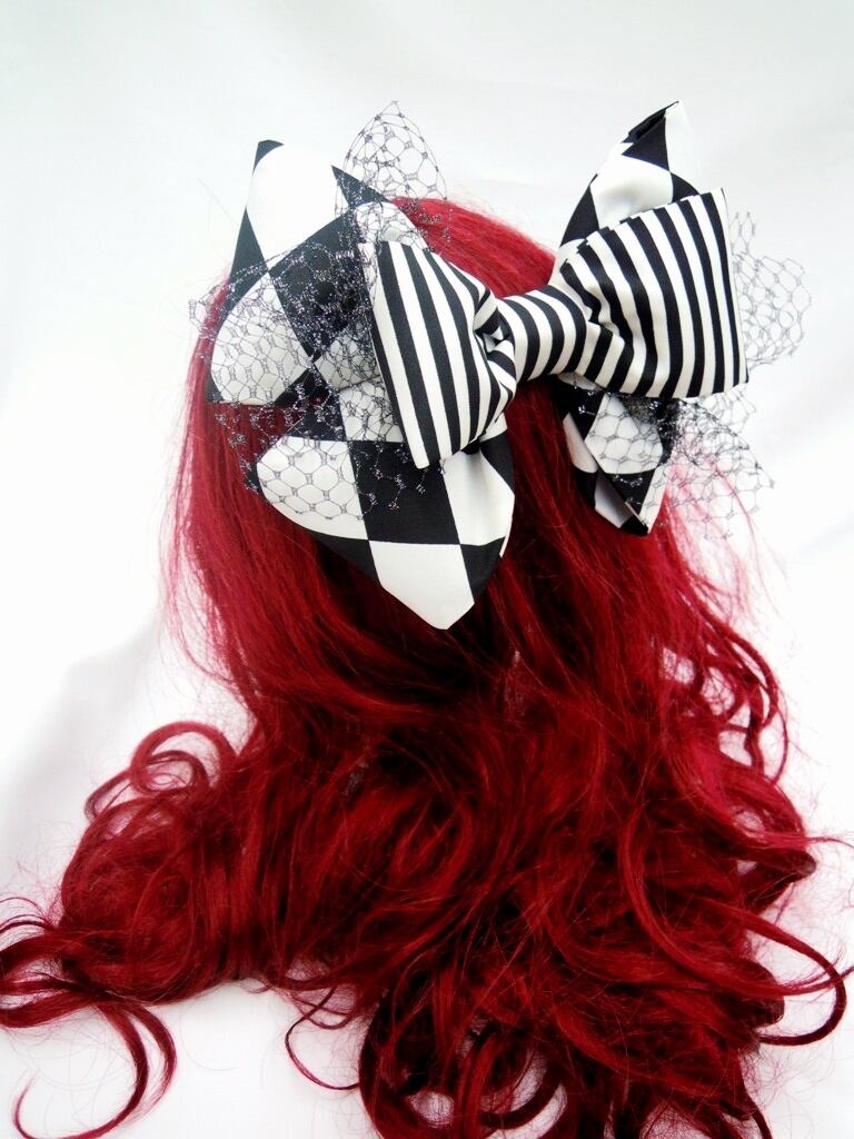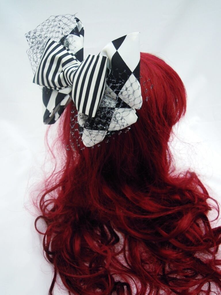 ダイヤ柄×ストライプBIGリボン(黒・ラメネット)