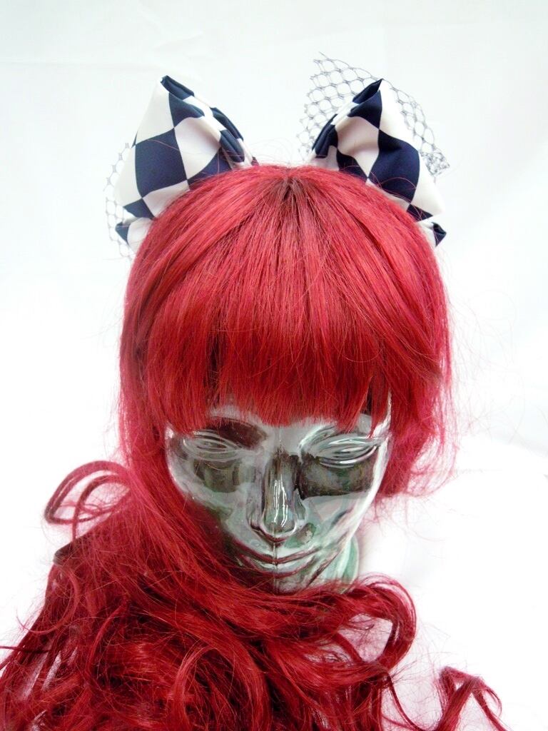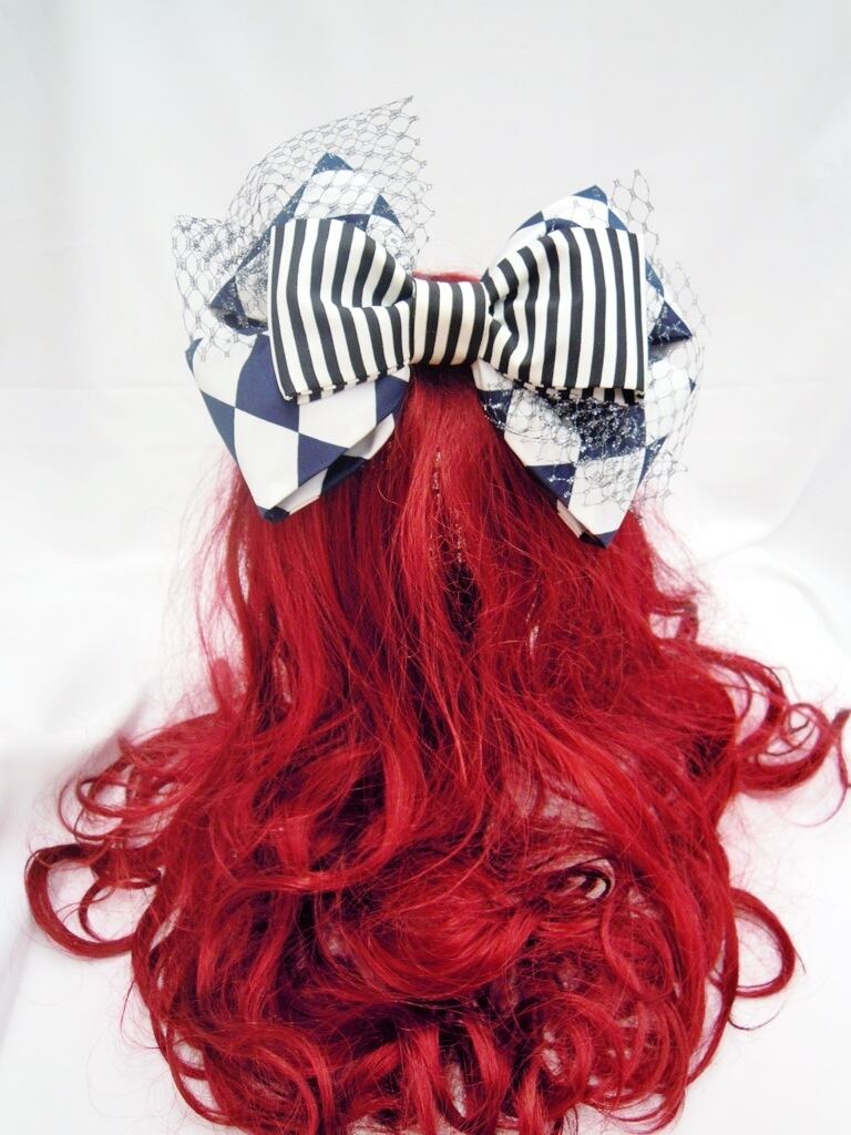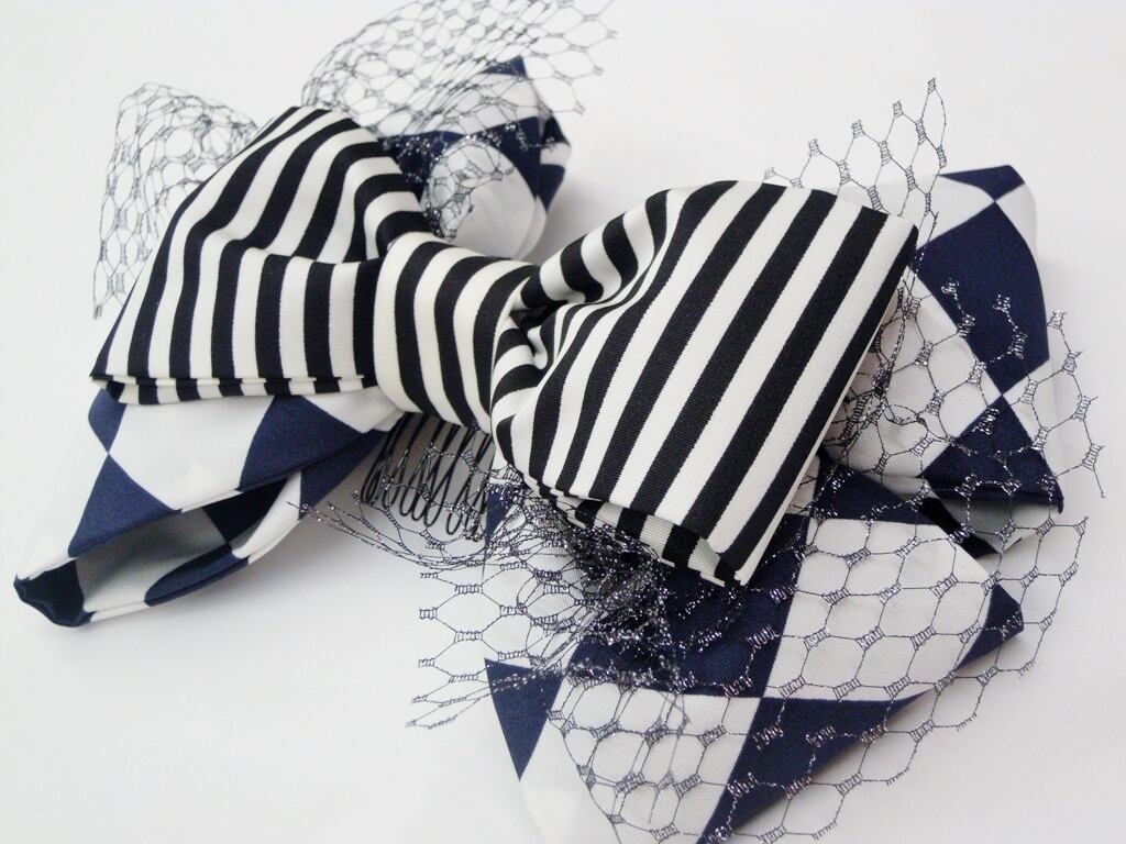 ダイヤ柄×ストライプBIGリボン(紺・ラメネット)