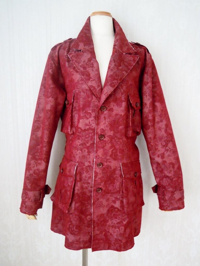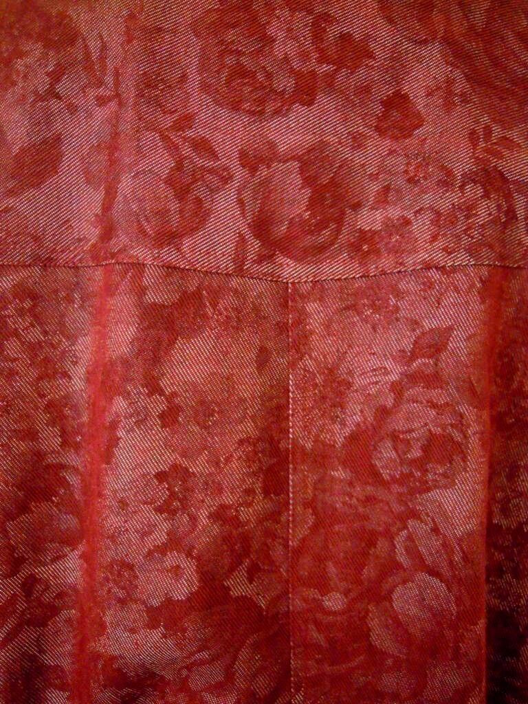 赤のデニムに薄っすらとお花の模様が映る生地を使用。