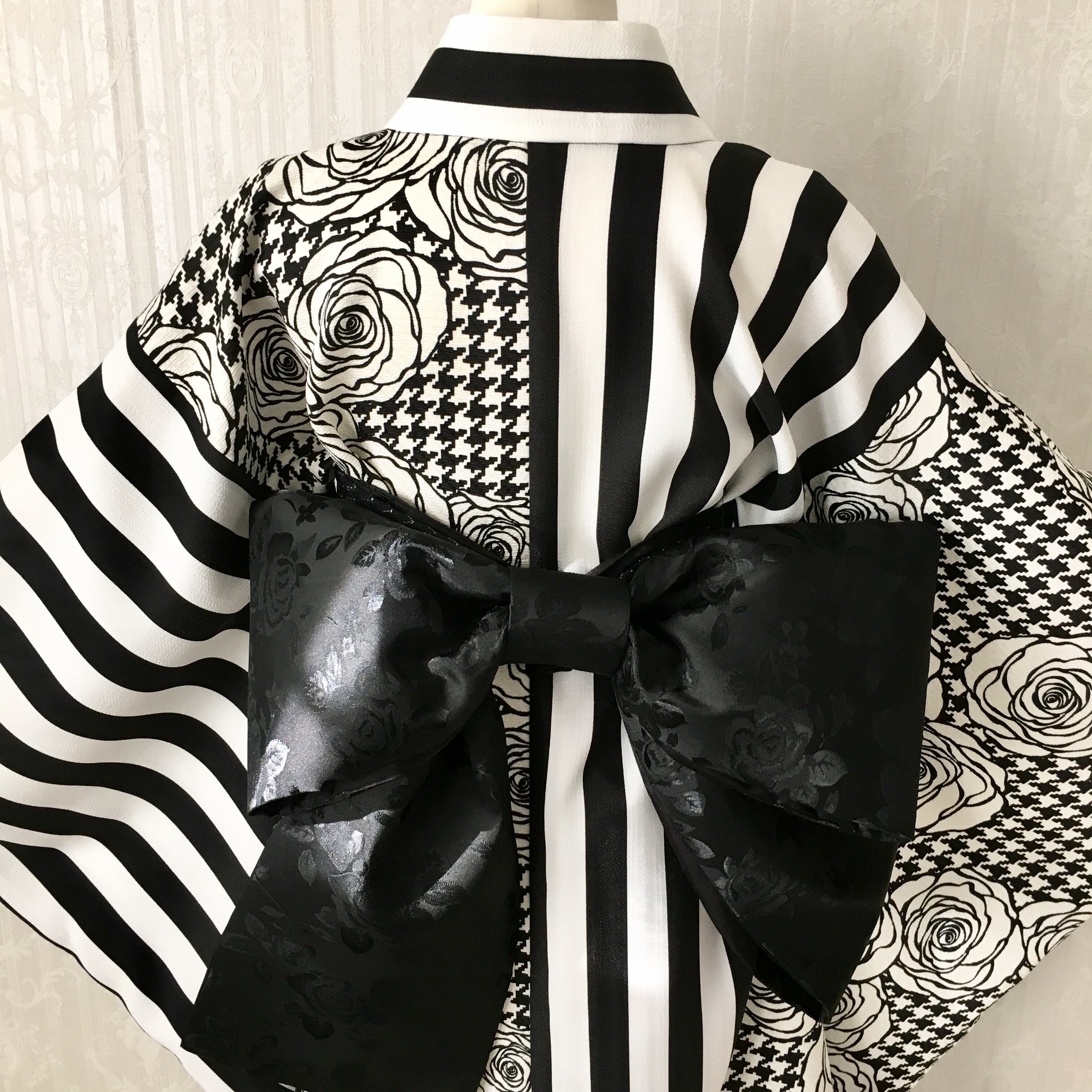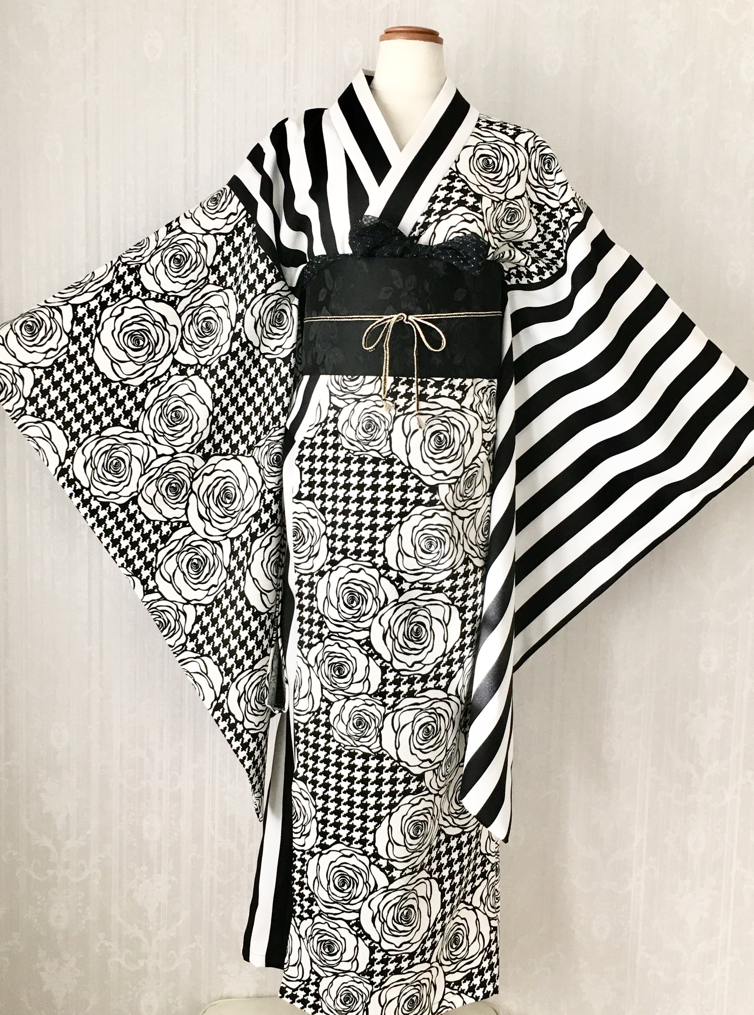 千鳥格子と薔薇×ストライプの着物