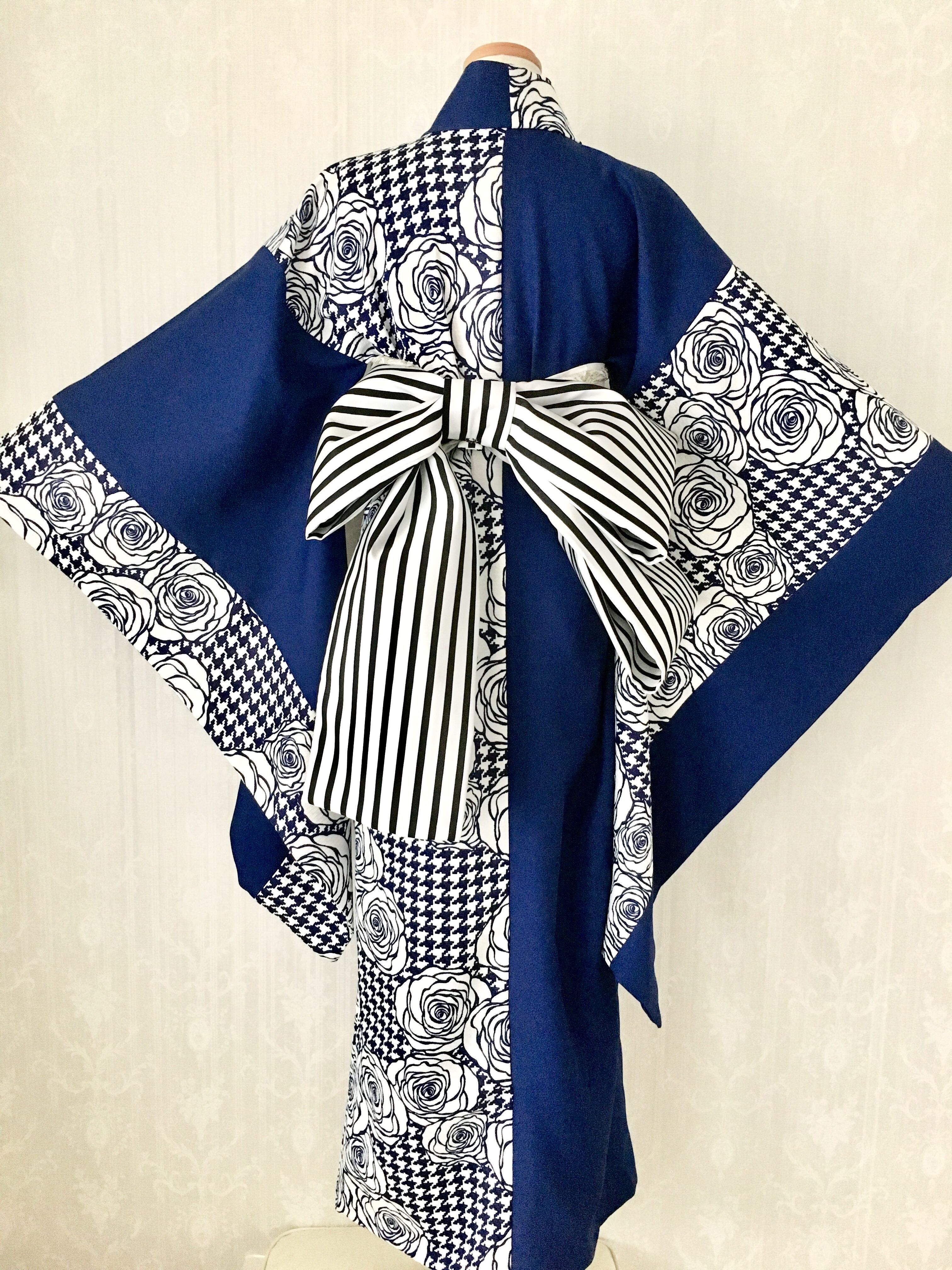 レトロ可愛いをテーマに”千鳥格子と薔薇柄”と紺無地を組み合わせた着物です。
