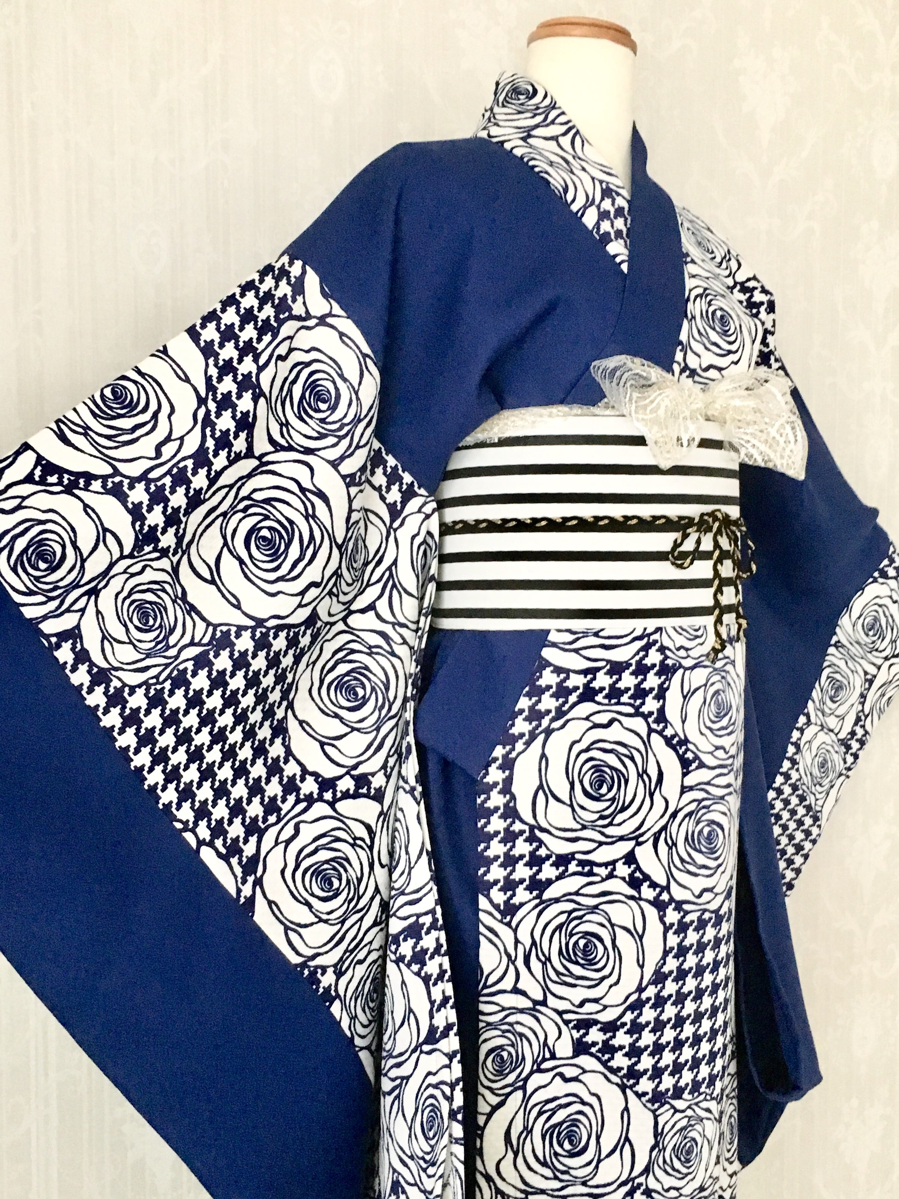 千鳥格子と薔薇 半身着物(紺)