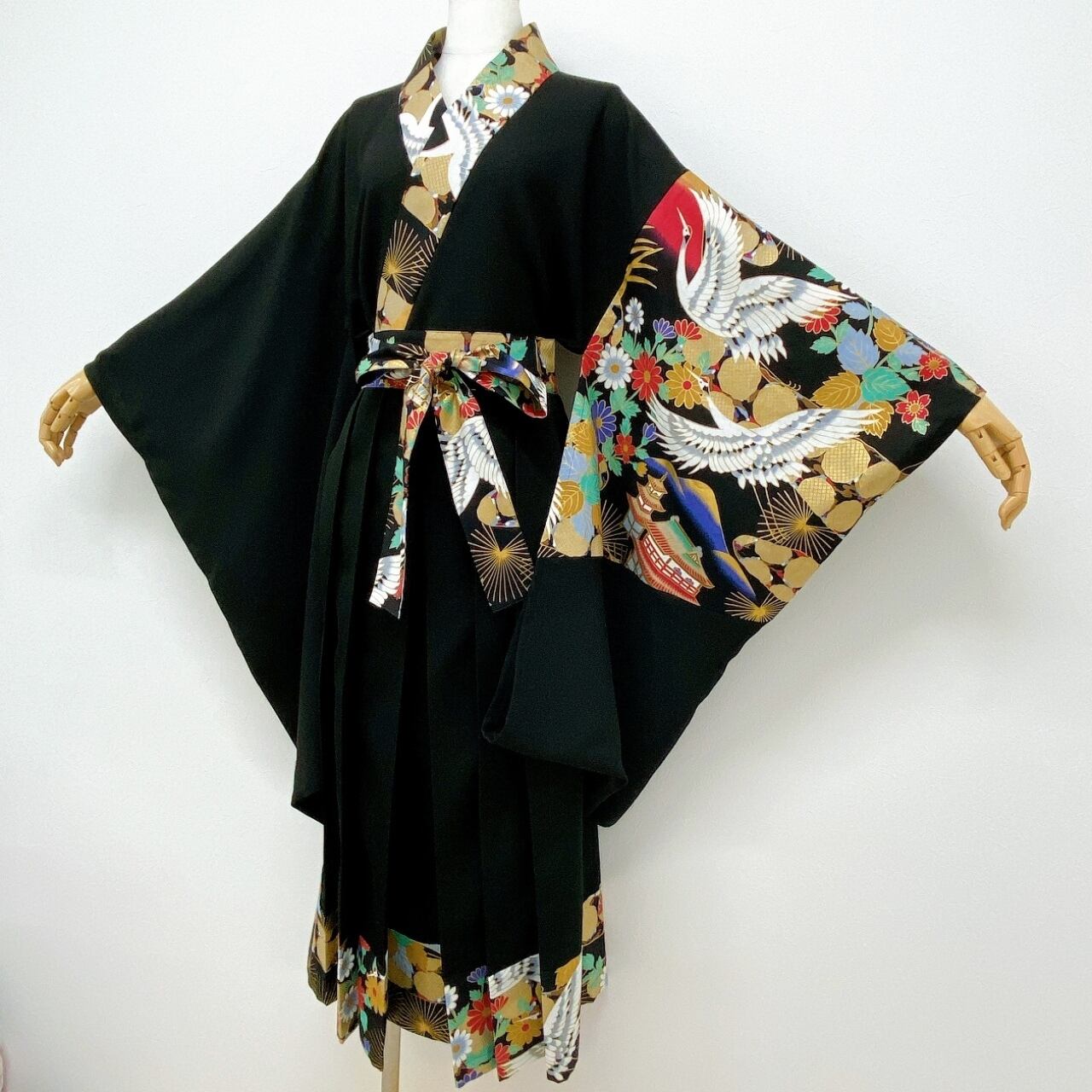 黒と和柄の切り替えが特徴的なハーフ丈の着物とロング袴のセットです。