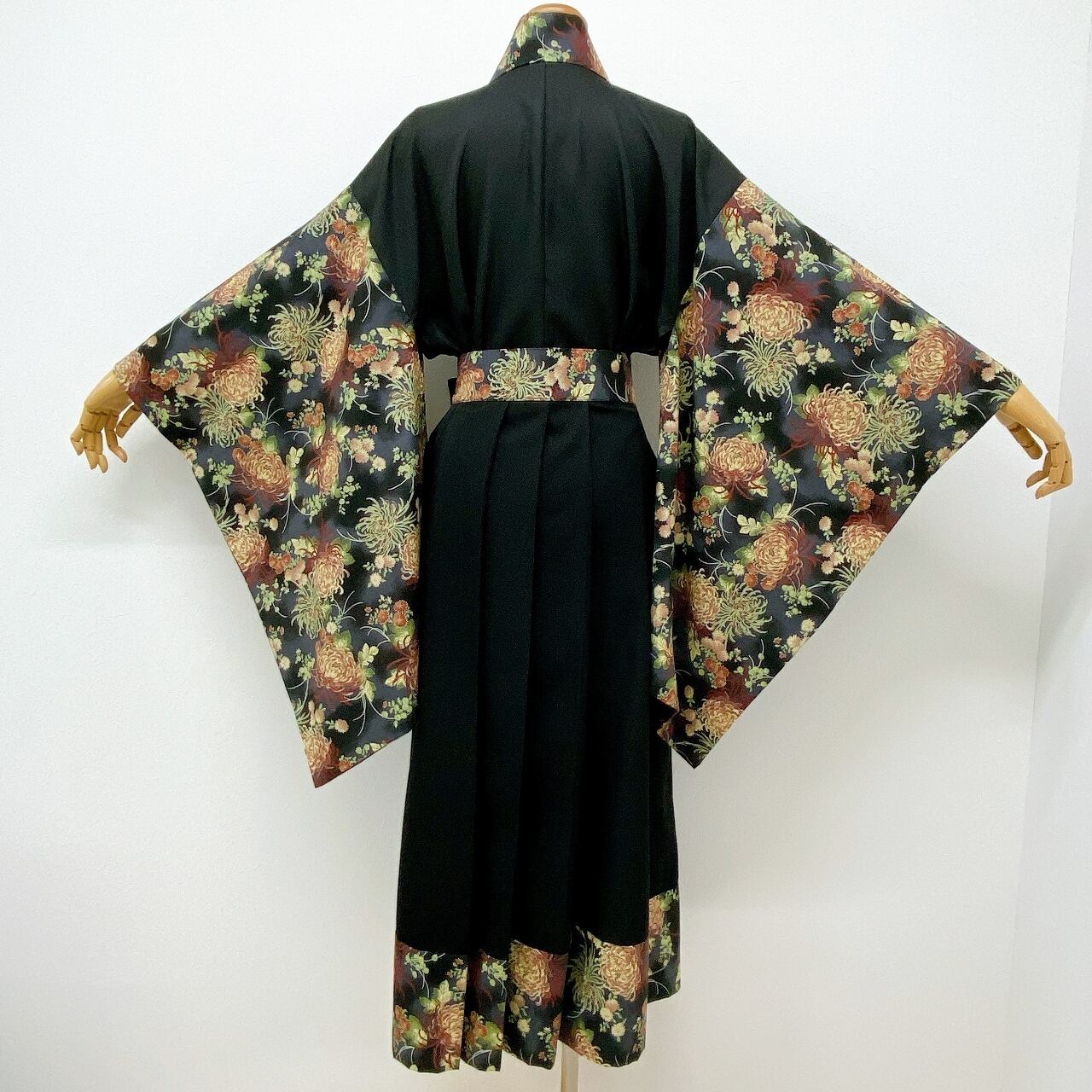 黒と和柄の切り替えが特徴的なハーフ丈の着物とロング袴のセットです。