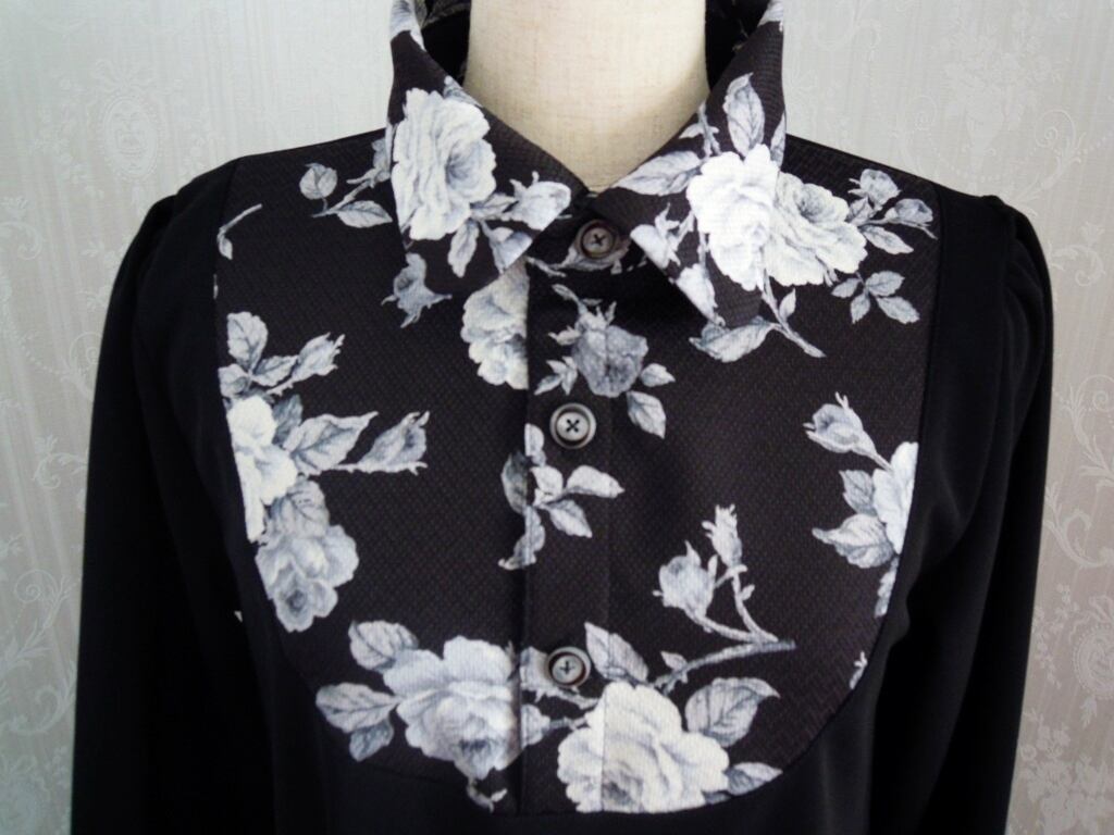 薔薇柄(黒)*和柄切り替えトラペーズワンピース(ロング)