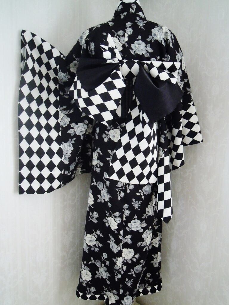 レトロ可愛いをテーマに上品な薔薇柄とポップなダイヤ柄を組み合わせた着物です。